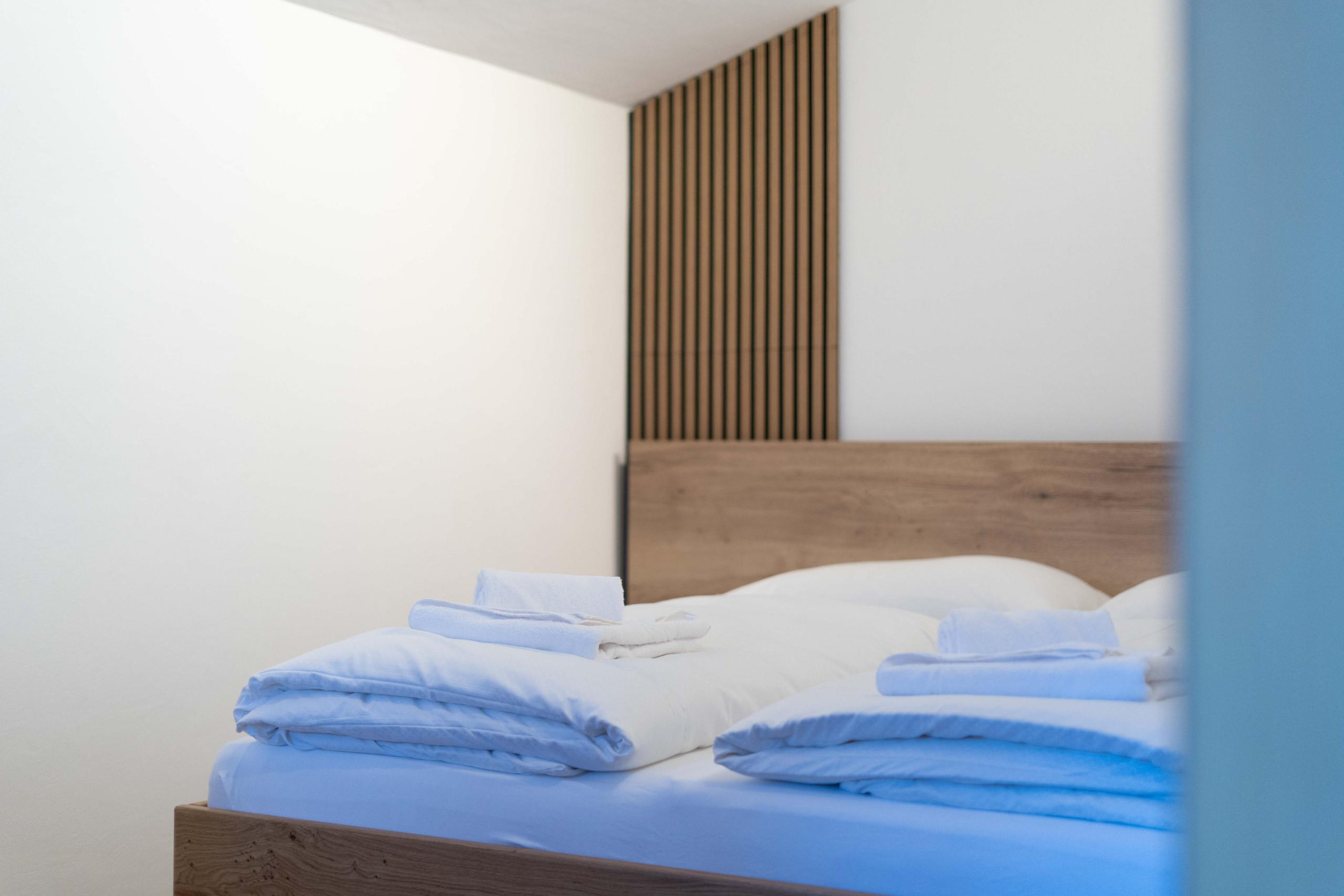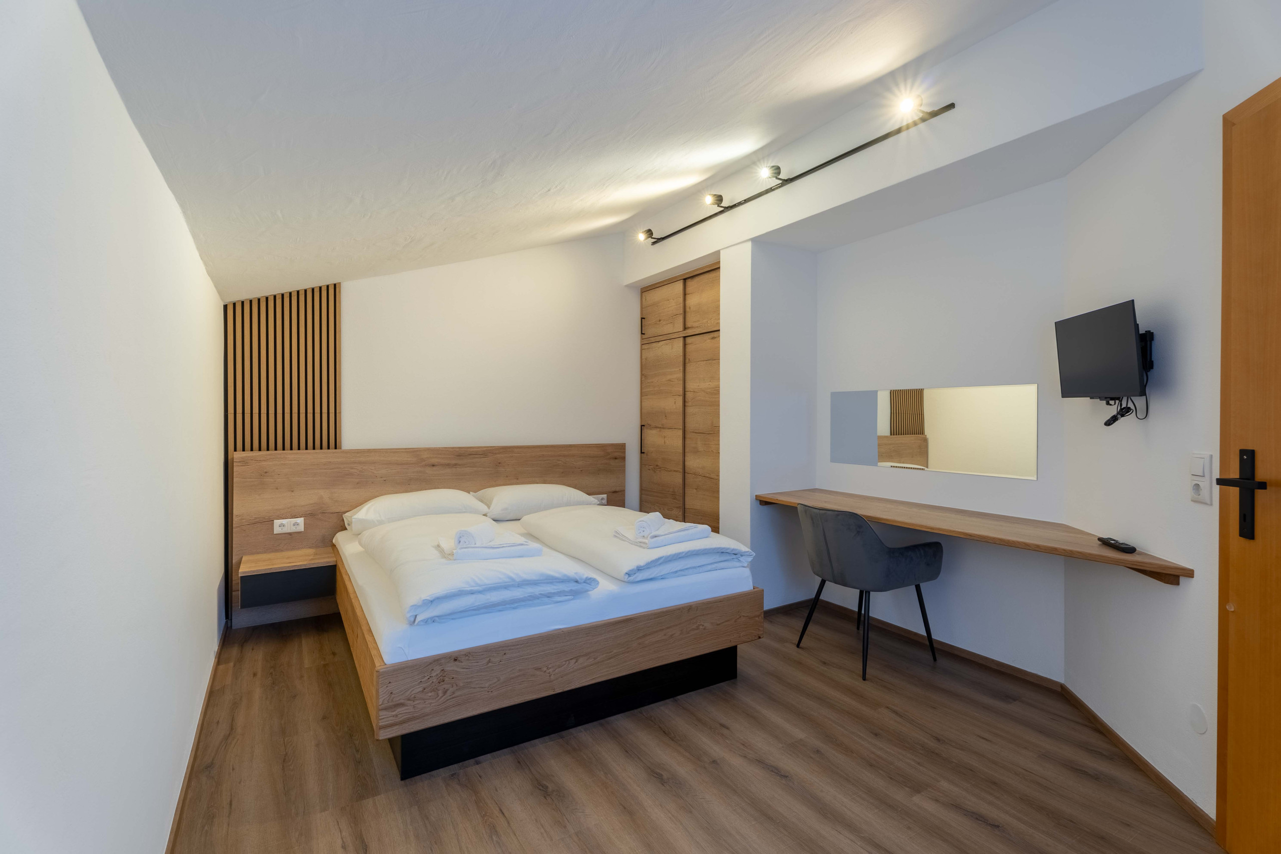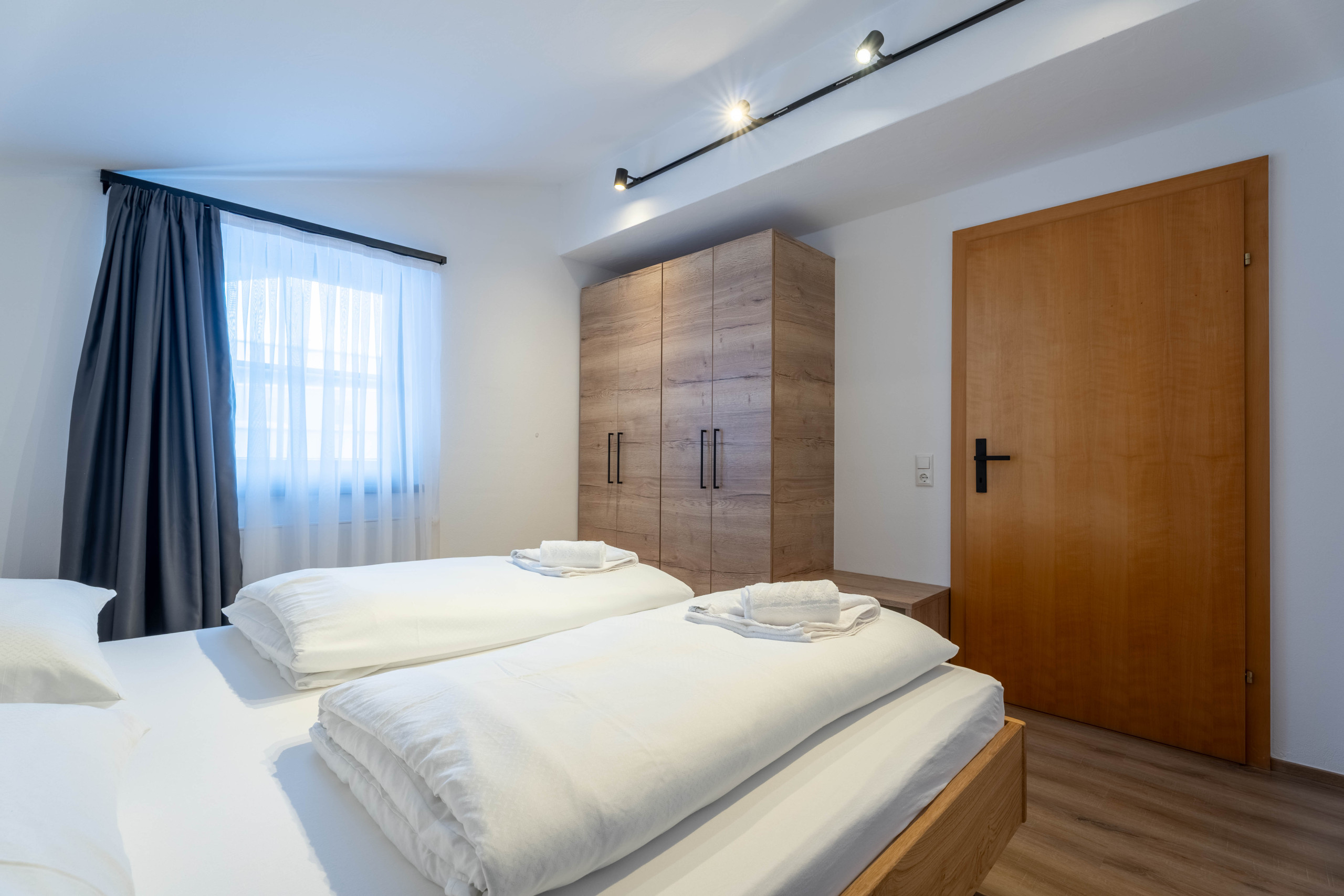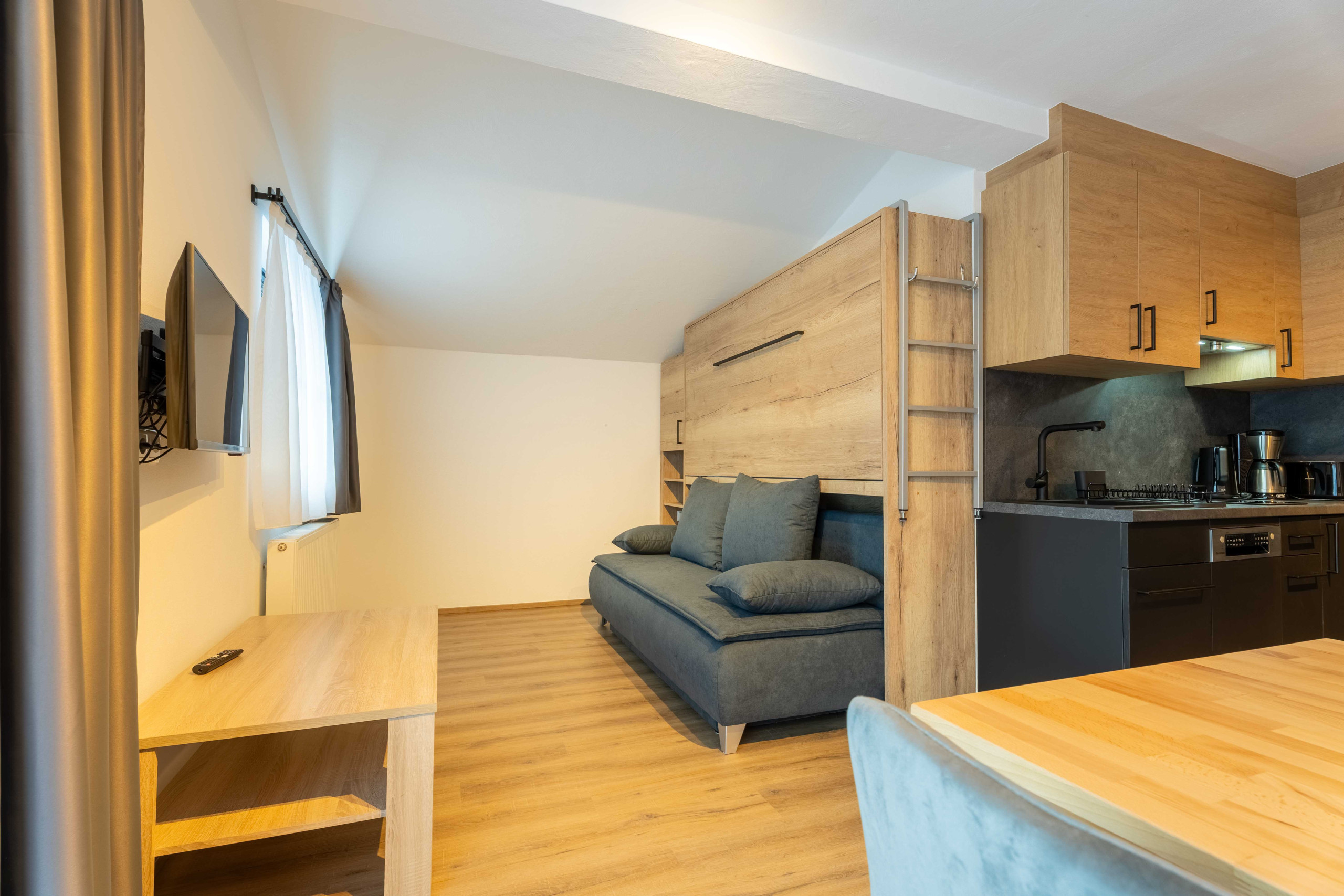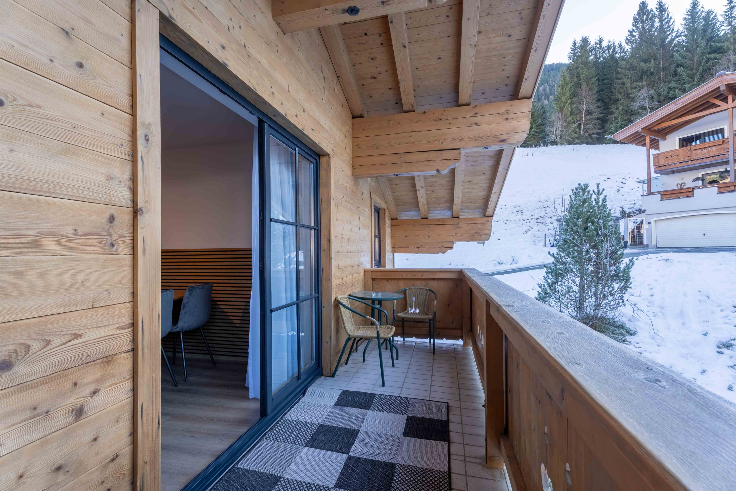 The apartment offers two bedrooms – one with a double bed and the second with twin or double beds plus an extra bed for a fifth person. The bright living area opens onto a balcony with lovely mountain views – the perfect spot to enjoy fresh alpine air and morning sunshine.