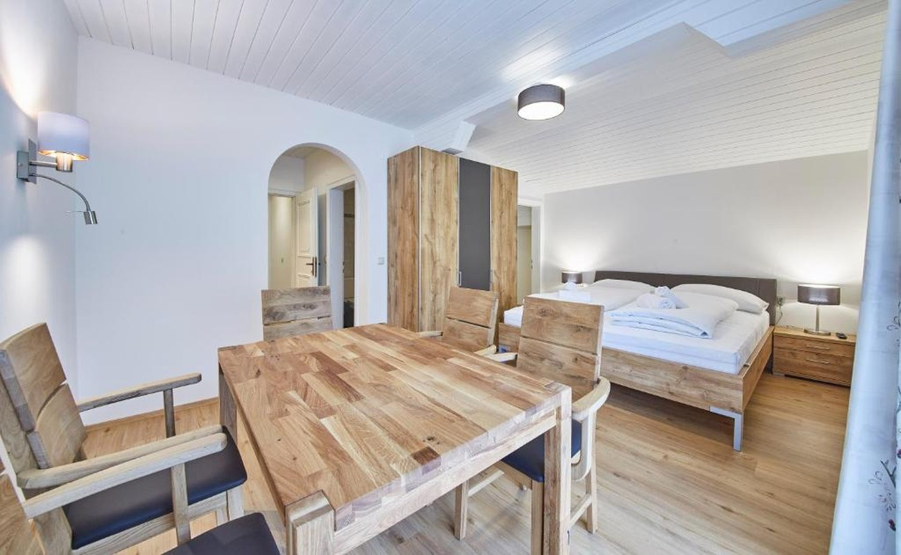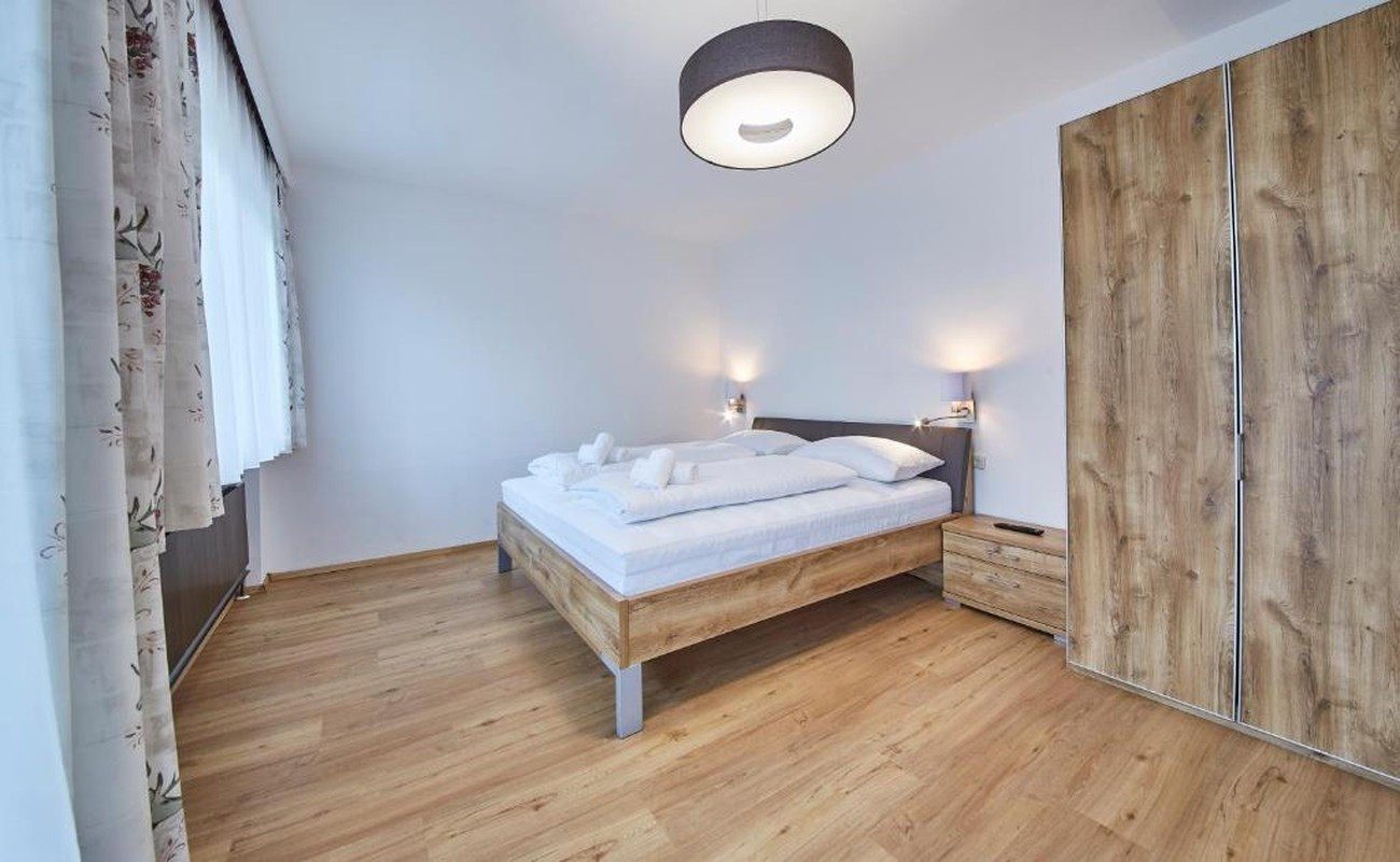 One of the bedrooms also serves as the dining area. A small, neighbouring room houses the compact kitchen, equipped with cooking plates, a fridge and a coffee machine, as well as everything needed for self-catering during your stay. Hair dryers are provided in the bathrooms. The furnishings are simple, functional and well kept – perfect for an active holiday in the mountains.