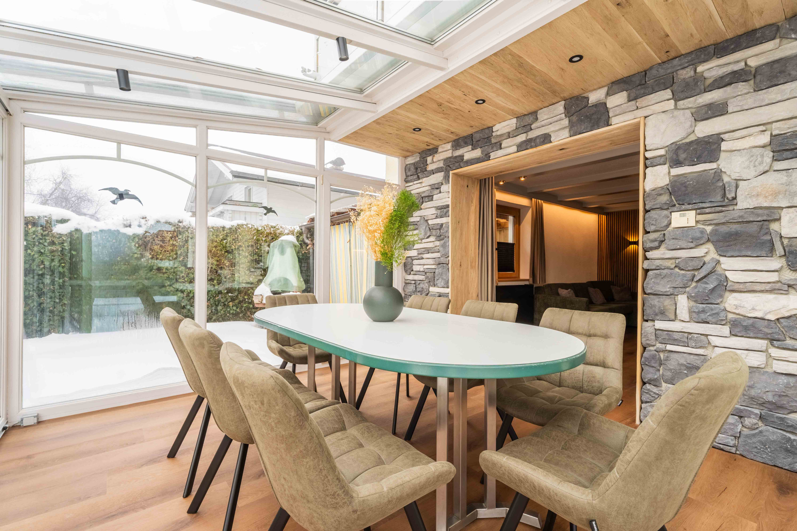The ground-floor apartment is spacious and, with 70 square metres, offers room for 1 to 6 guests. The two bedrooms are each furnished with a comfortable double bed and their own TV, and each sleeps two guests. In the living room, there is a sofa bed that sleeps an additional two guests. In total, one bathroom with shower, bathtub and toilet is available. From the cosy living room, you have direct access to the beautiful conservatory with panoramic views of the surrounding mountains. The apartment also offers direct garden access from the conservatory. The fully equipped kitchen allows you to treat your loved ones to delicious meals even while on holiday.