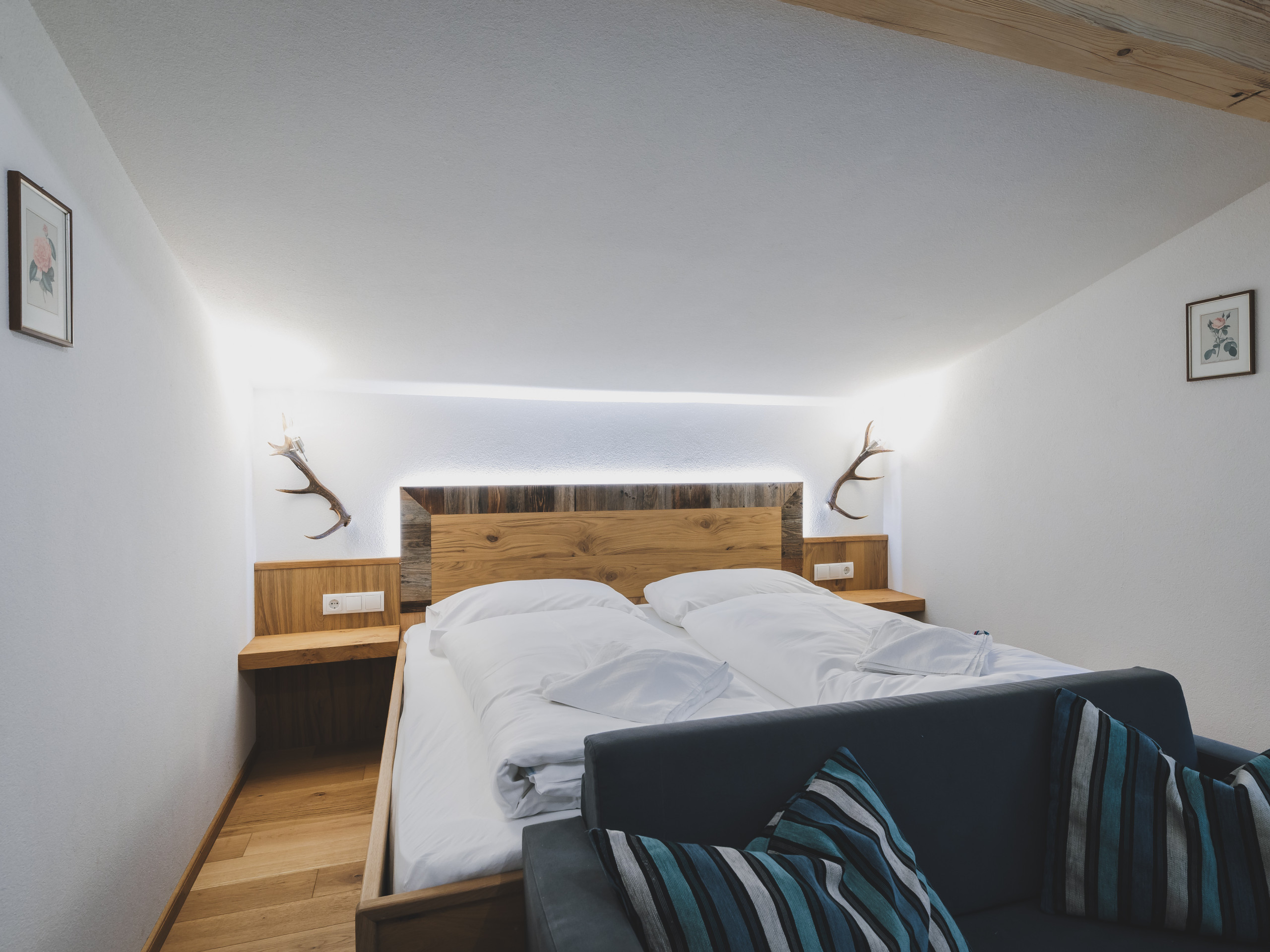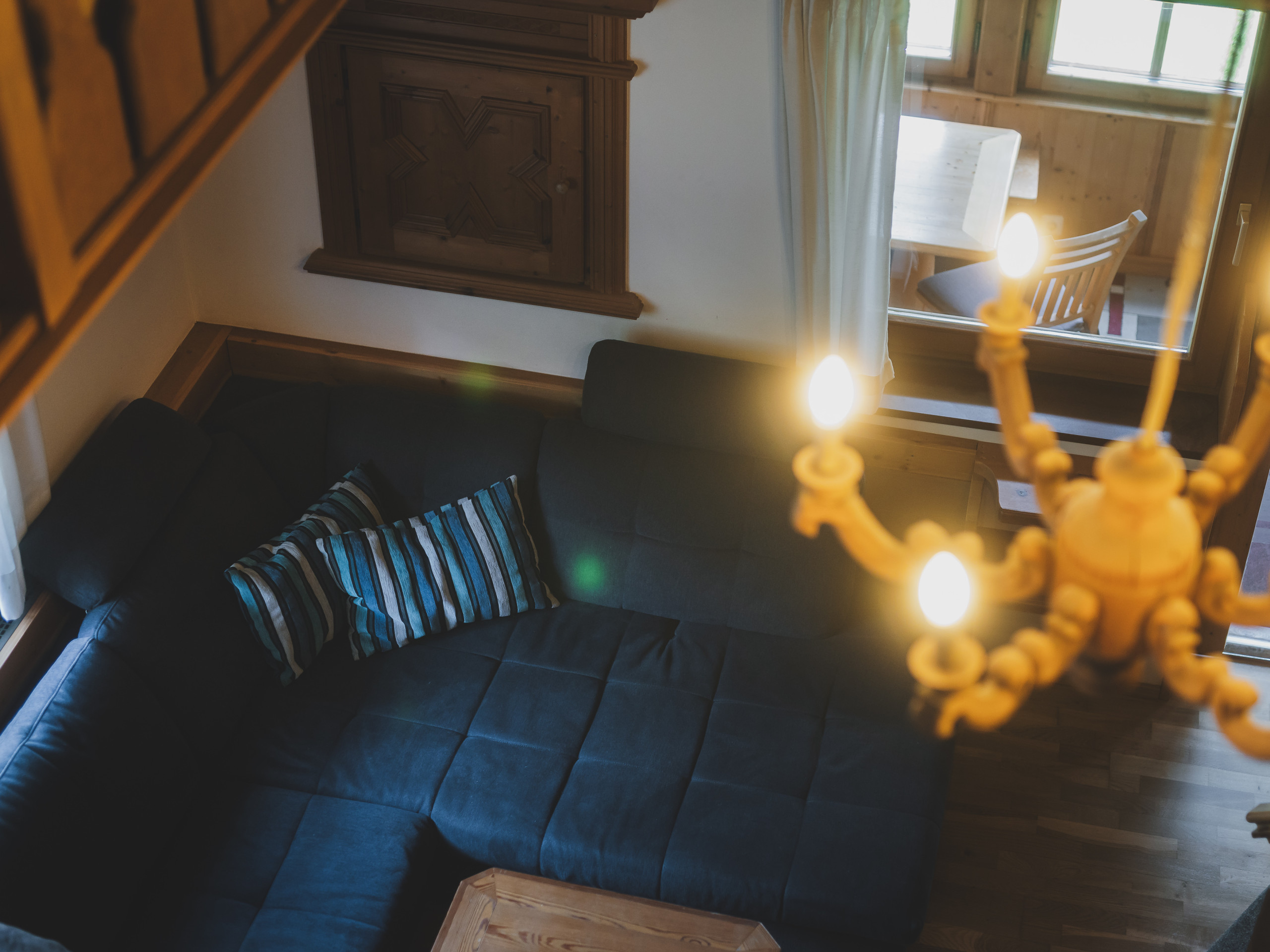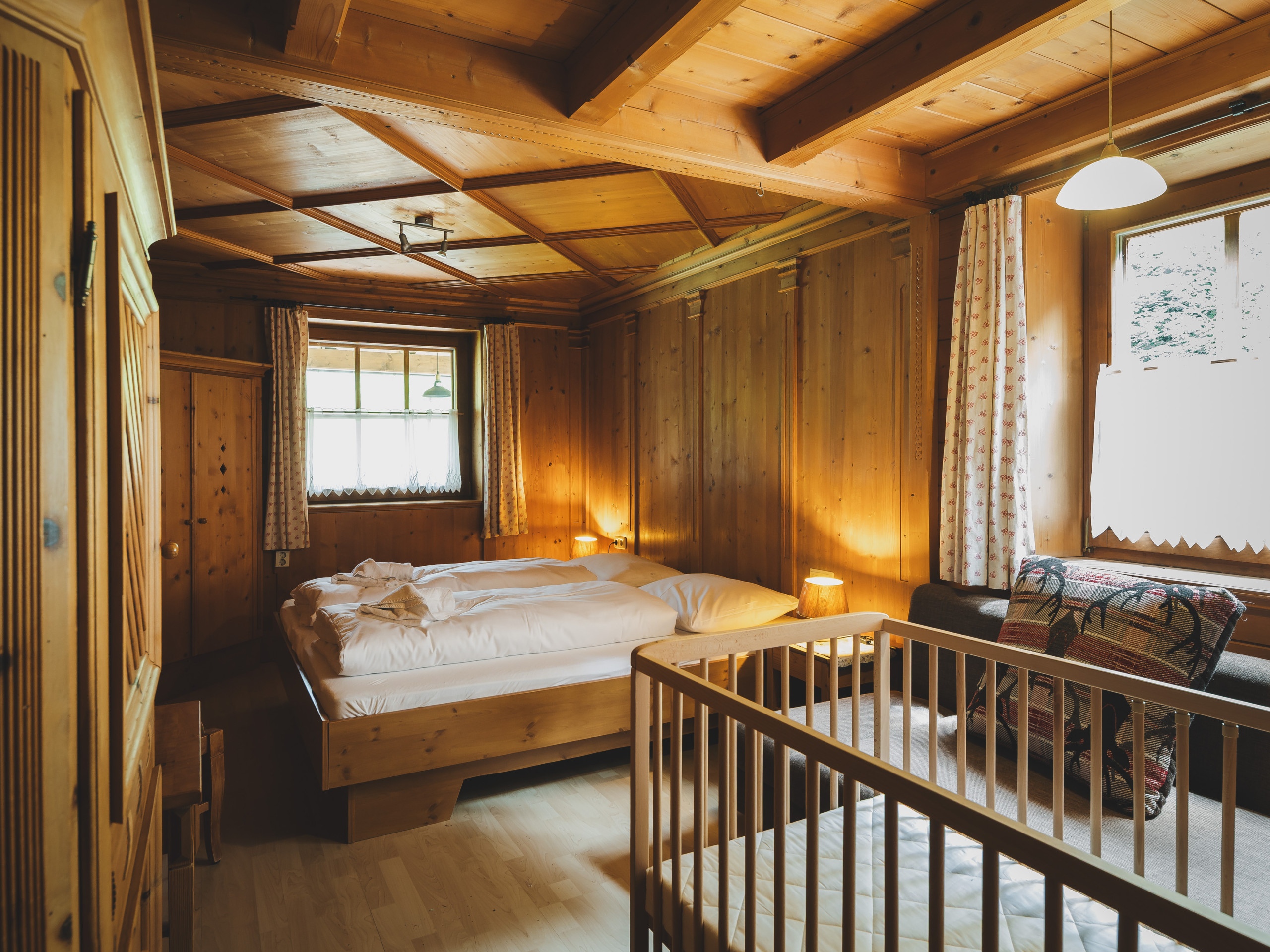Inside, the chalet offers four cozy double bedrooms – ideal for groups of up to eight guests. One bedroom is located on the ground floor, while the remaining three are upstairs beneath charming slanted ceilings. The double-height living area forms the warm heart of the home – spacious yet cozy, with traditional woodwork and a welcoming ambiance. For added comfort, there's also a delightful winter garden – a second sitting area perfect for reading or relaxing.