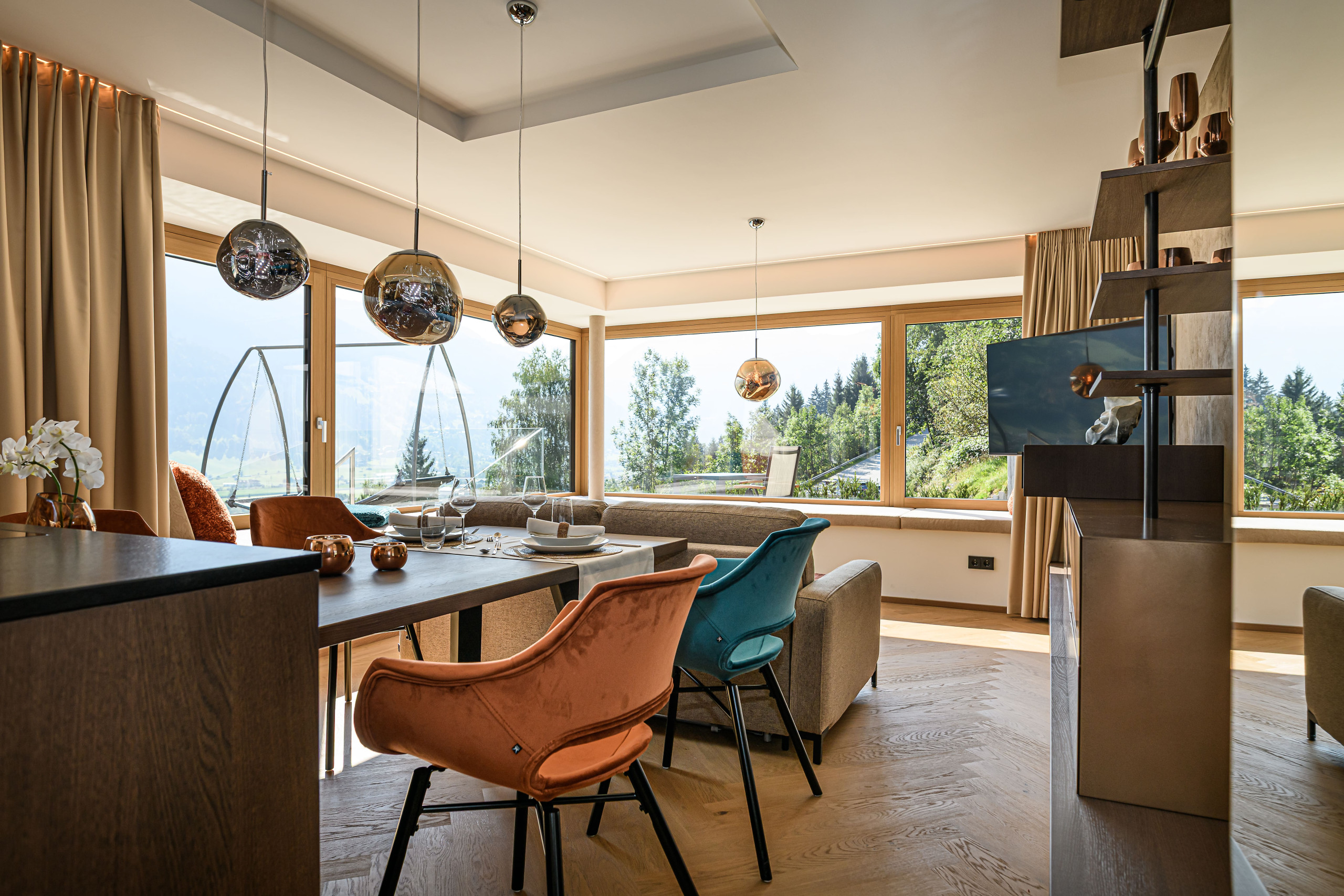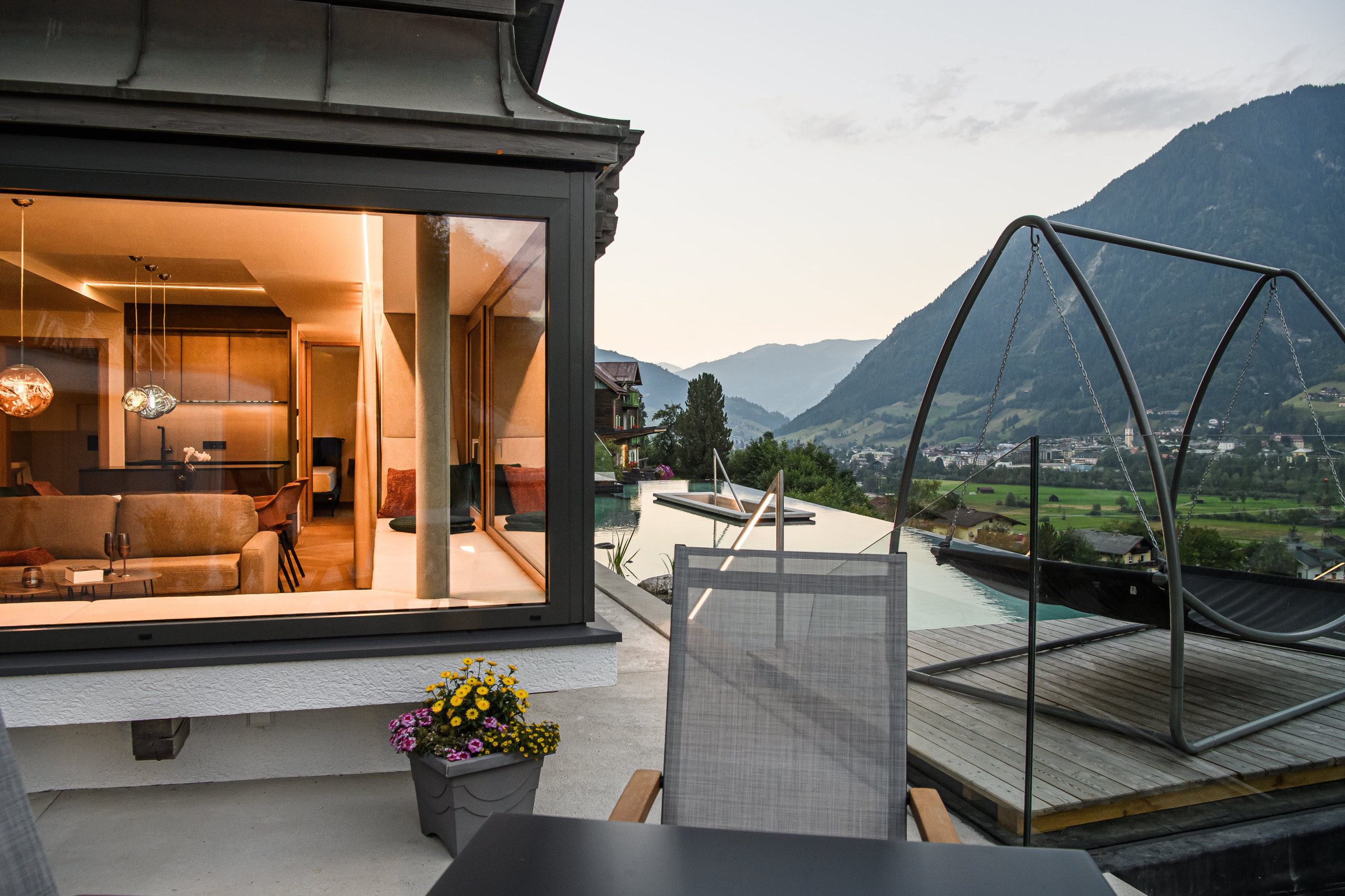 Grote ramen openen het uitzicht over het dal en de omliggende bergen.