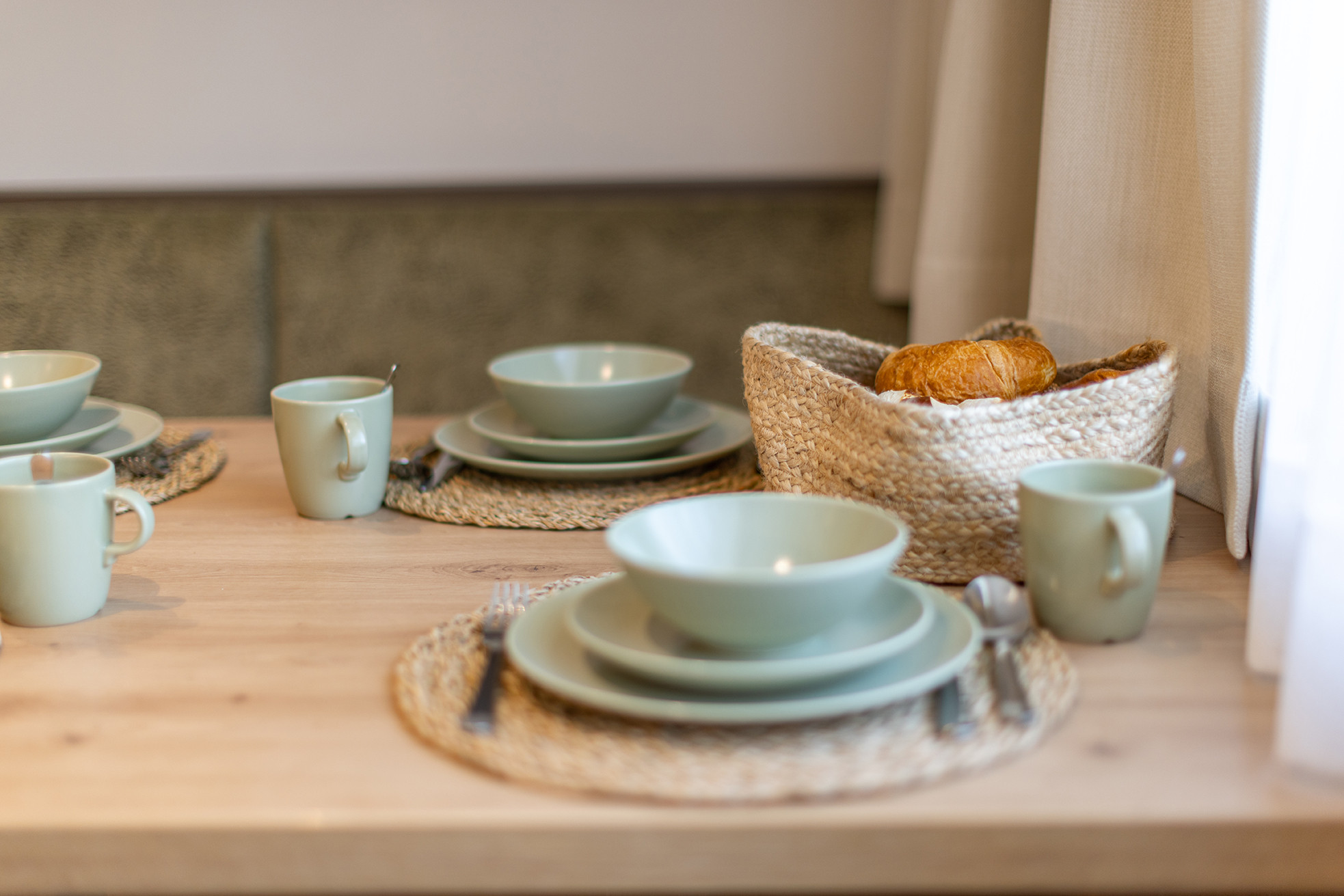 De lichte woon- en eetruimte nodigt uit om te ontspannen en beschikt over een slaapbank voor maximaal twee extra gasten. Uw privé balkon met eettafel is de perfecte plek om te genieten van de frisse berglucht en de rustige omgeving.