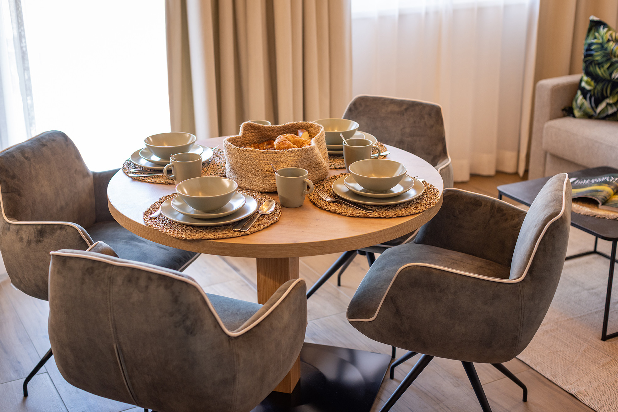 Het appartement beschikt over een aparte slaapkamer met tweepersoonsbed en een elegante woonkamer met een grote bank die kan worden omgevormd tot extra slaapplaatsen voor maximaal twee gasten. De open keuken is volledig uitgerust met kookplaat, oven, koelkast met vriesvak, koffiemachine en waterkoker – ideaal voor een ontspannen verblijf.