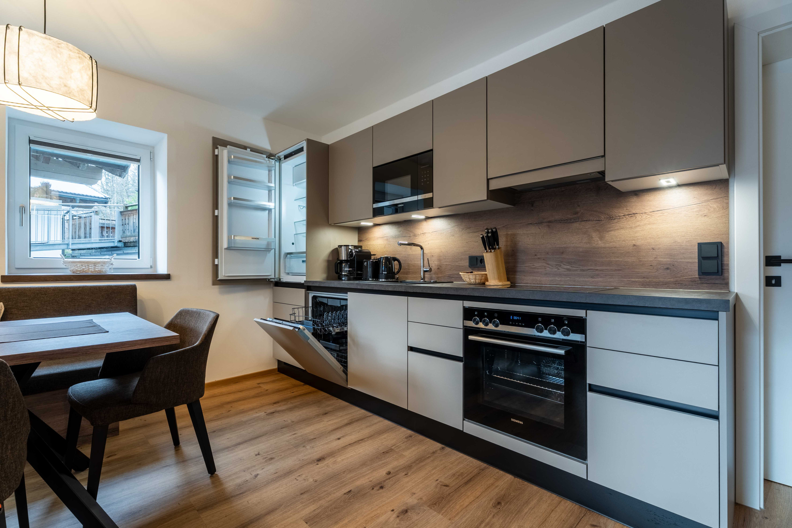 Het appartement beschikt over twee comfortabele slaapkamers met tweepersoonsbedden, elk met een eigen en suite badkamer (douche & toilet) – ideaal voor koppels of gezinnen die privacy waarderen. De lichte woonruimte combineert een open keuken, eethoek en zithoek met een gezellige bank en tv. De volledig uitgeruste keuken heeft een oven, kookplaat, magnetron, vaatwasser, koffiemachine en alle nodige kookgerei. Naast de woonkamer bevindt zich de privé Finse sauna – perfect om te ontspannen na een actieve dag in de bergen. Vanaf het terras geniet u van een prachtig uitzicht op de Leoganger Steinberge. Alle douches en toiletten bevinden zich in aparte ruimtes, voor extra comfort en gemak.