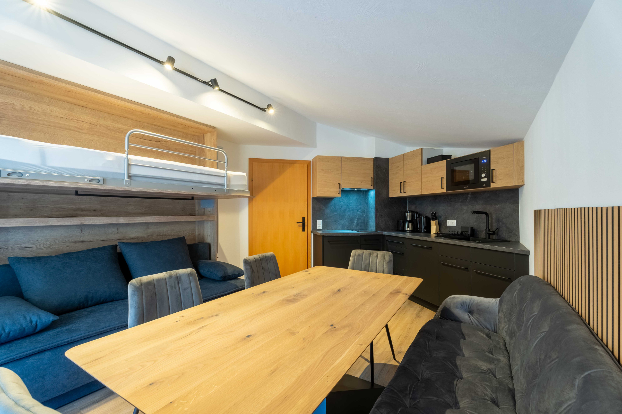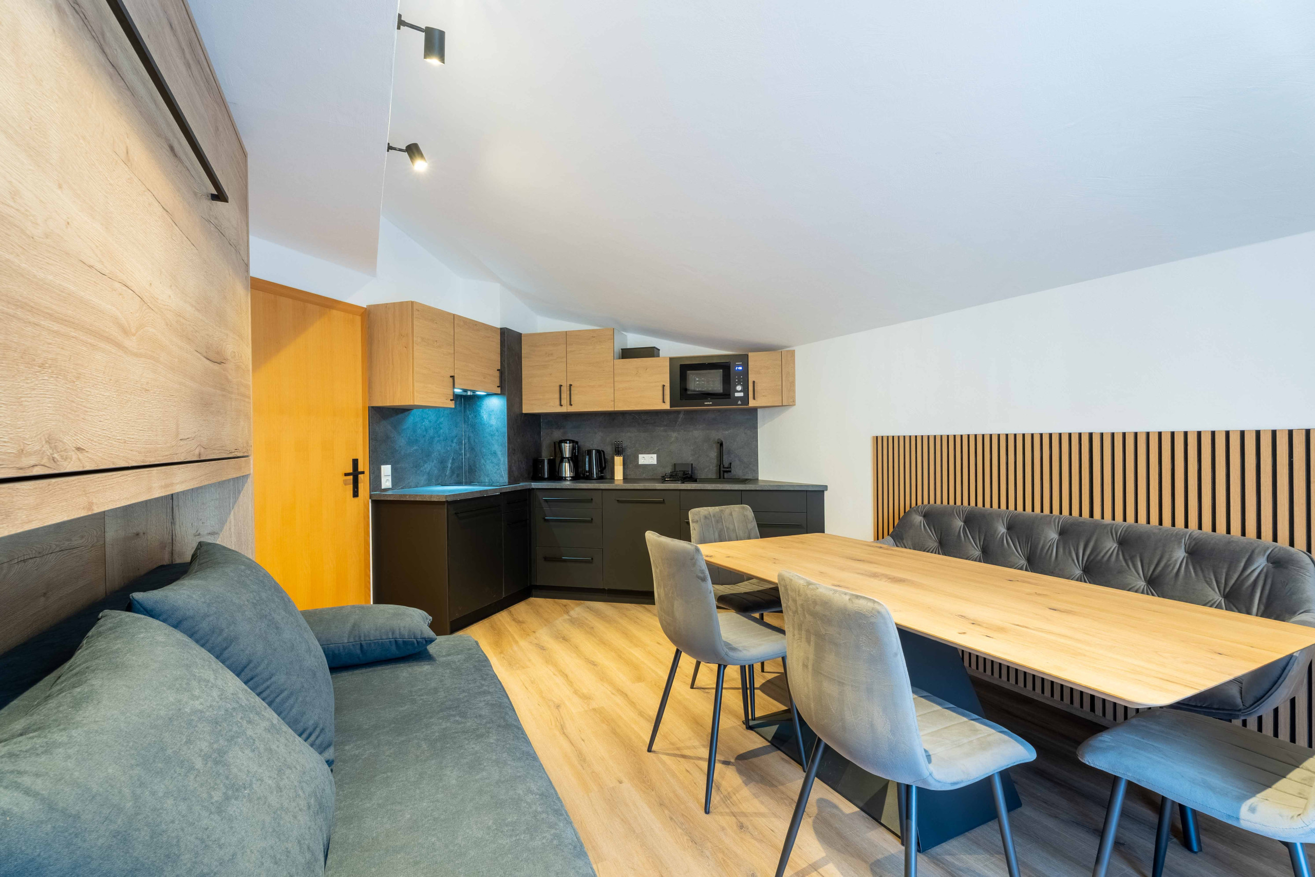 De stijlvolle, volledig uitgeruste keuken heeft alles wat u nodig hebt: oven, kookplaat, magnetron, vaatwasser, koelkast, waterkoker en koffiezetapparaat. De eethoek is ideaal voor gezellige avonden na een dag in de bergen.