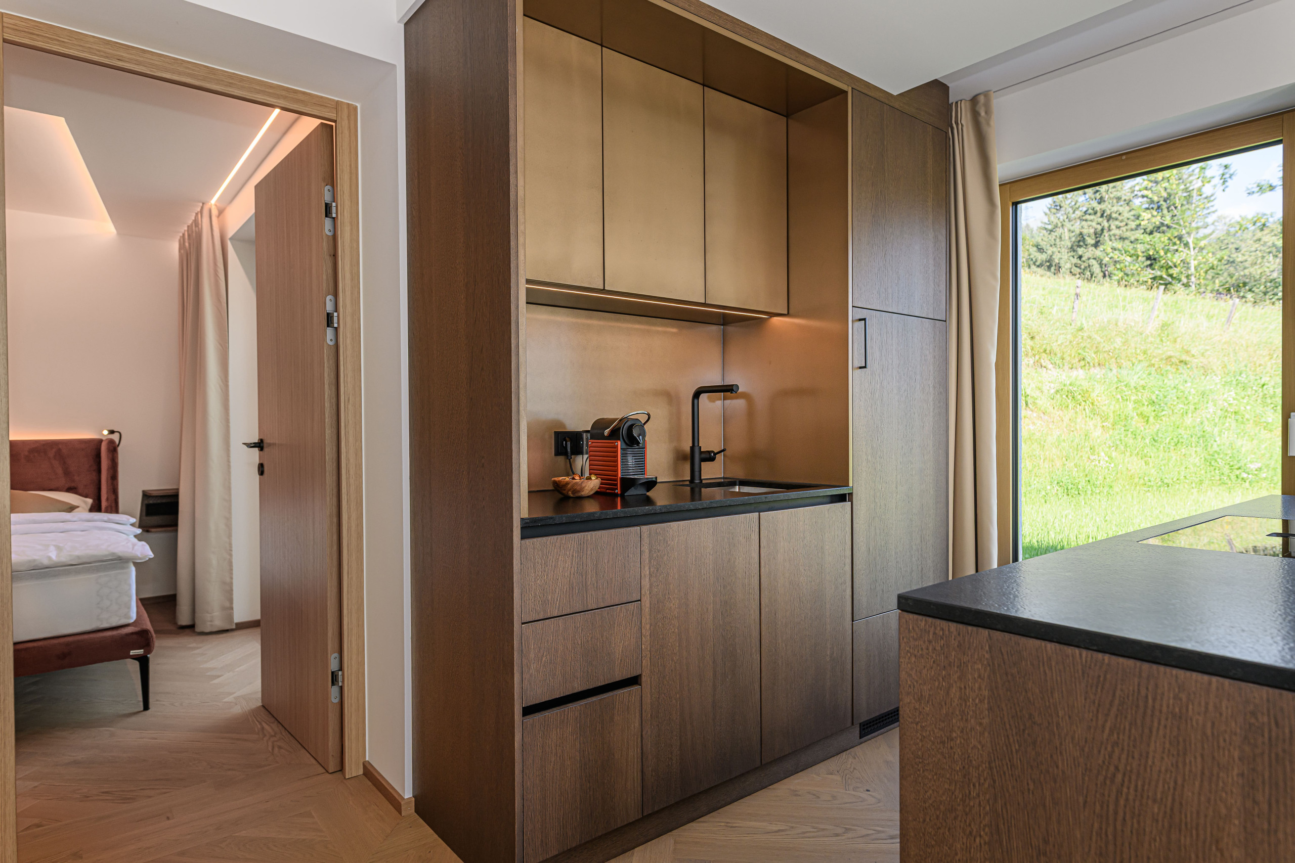 Die voll ausgestattete Küche – inklusive Kaffeemaschine und Geschirrspüler – bietet alles für genussvolle Abende. Für den besonderen Anlass steht sogar ein Weinkühler im Apartment zur Verfügung.