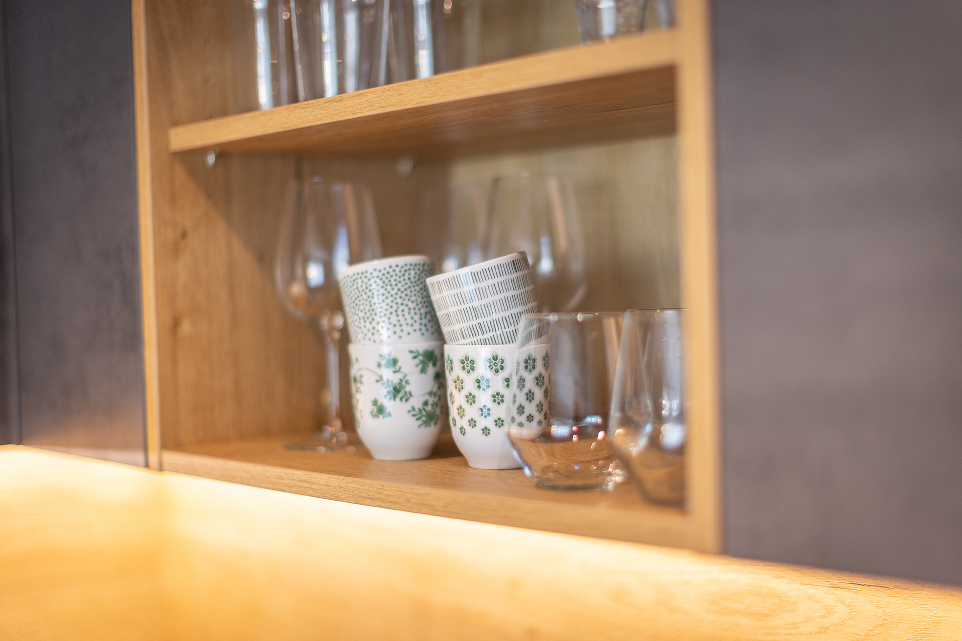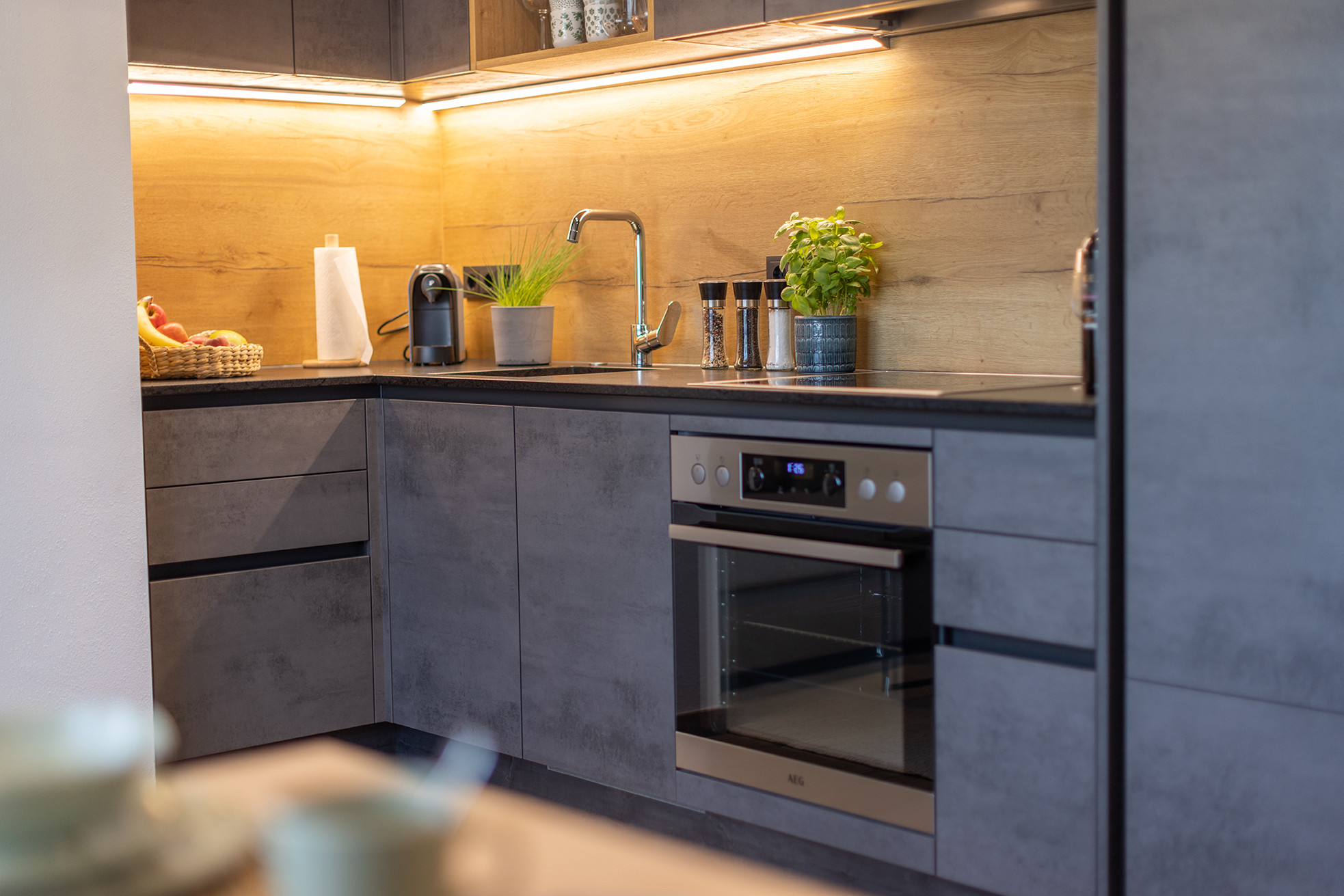 Die offene Küche ist vollständig ausgestattet mit Herd, Backofen, Kühlschrank mit Gefrierfach, Kaffeemaschine und Wasserkocher – ideal für ein schnelles Frühstück oder ein entspanntes Abendessen.