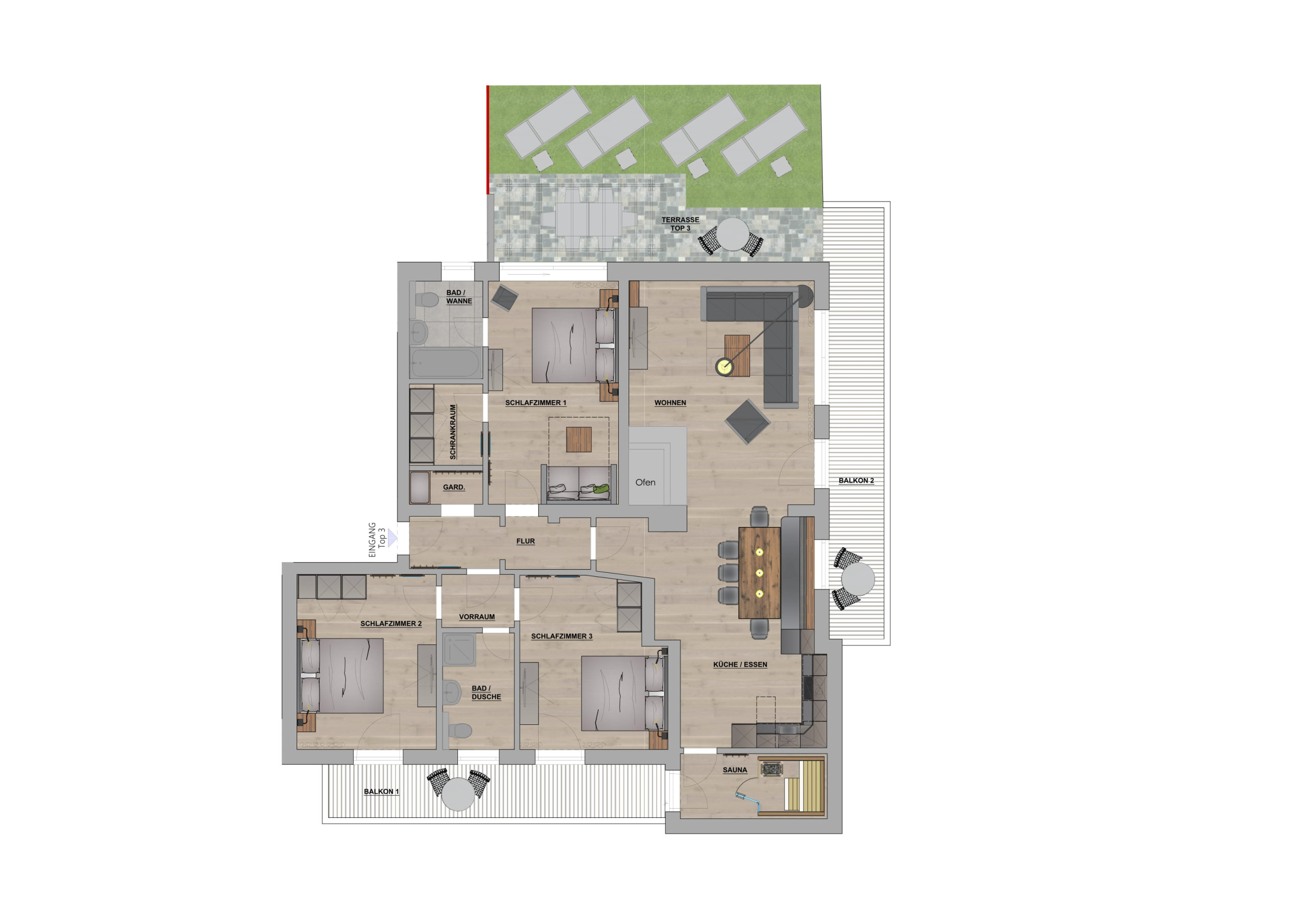 3 Schlafzimmer (2x Doppelbett, 1x Doppelbett + Doppelschlafsofa)