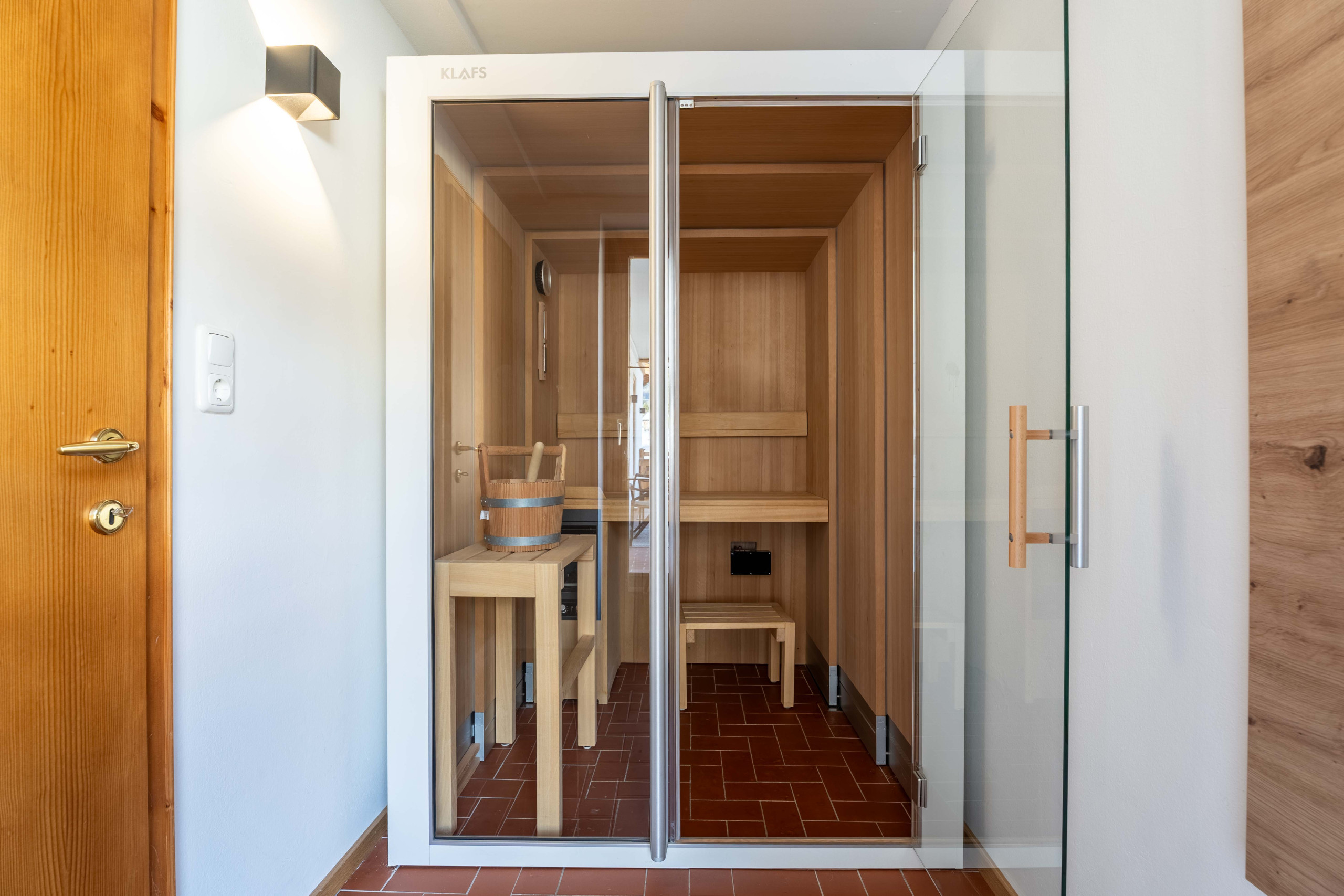 Nach einem aktiven Tag in den Bergen können Sie in Ihrer privaten Sauna entspannen oder die Sonne auf der großen Terrasse mit herrlichem Blick auf die Steinberge genießen. Hier finden Sie Ruhe und Erholung – mit der Natur direkt vor der Tür.