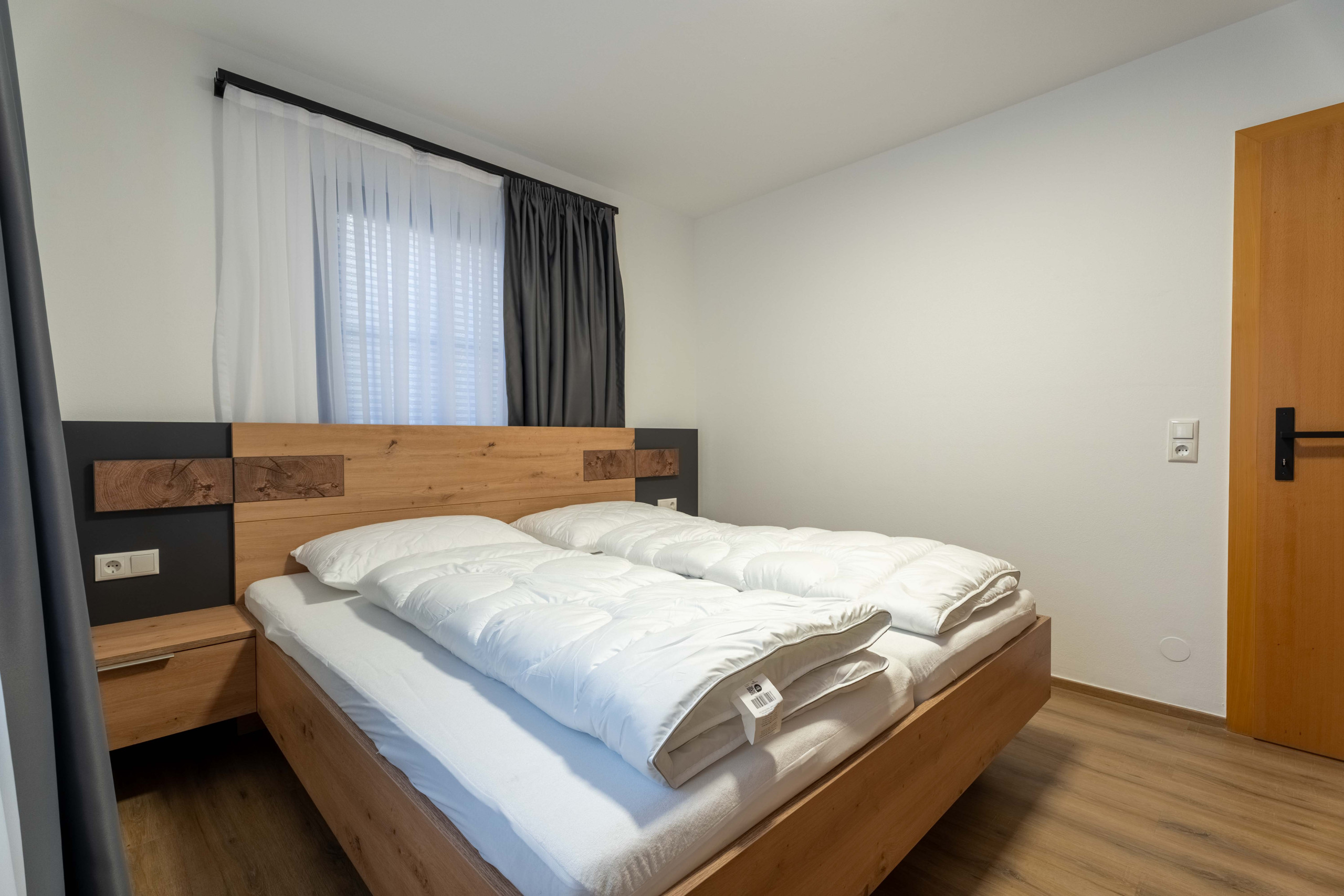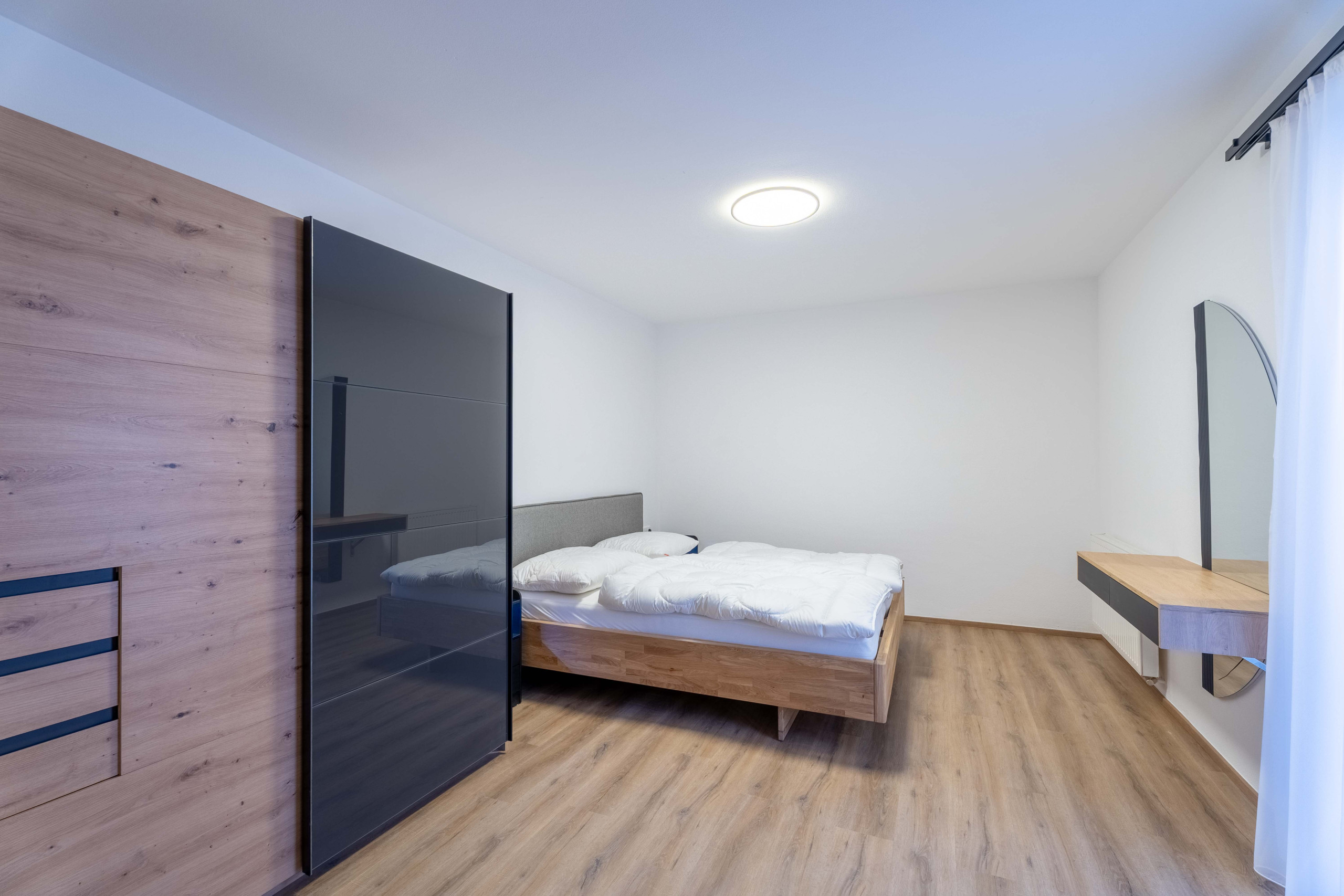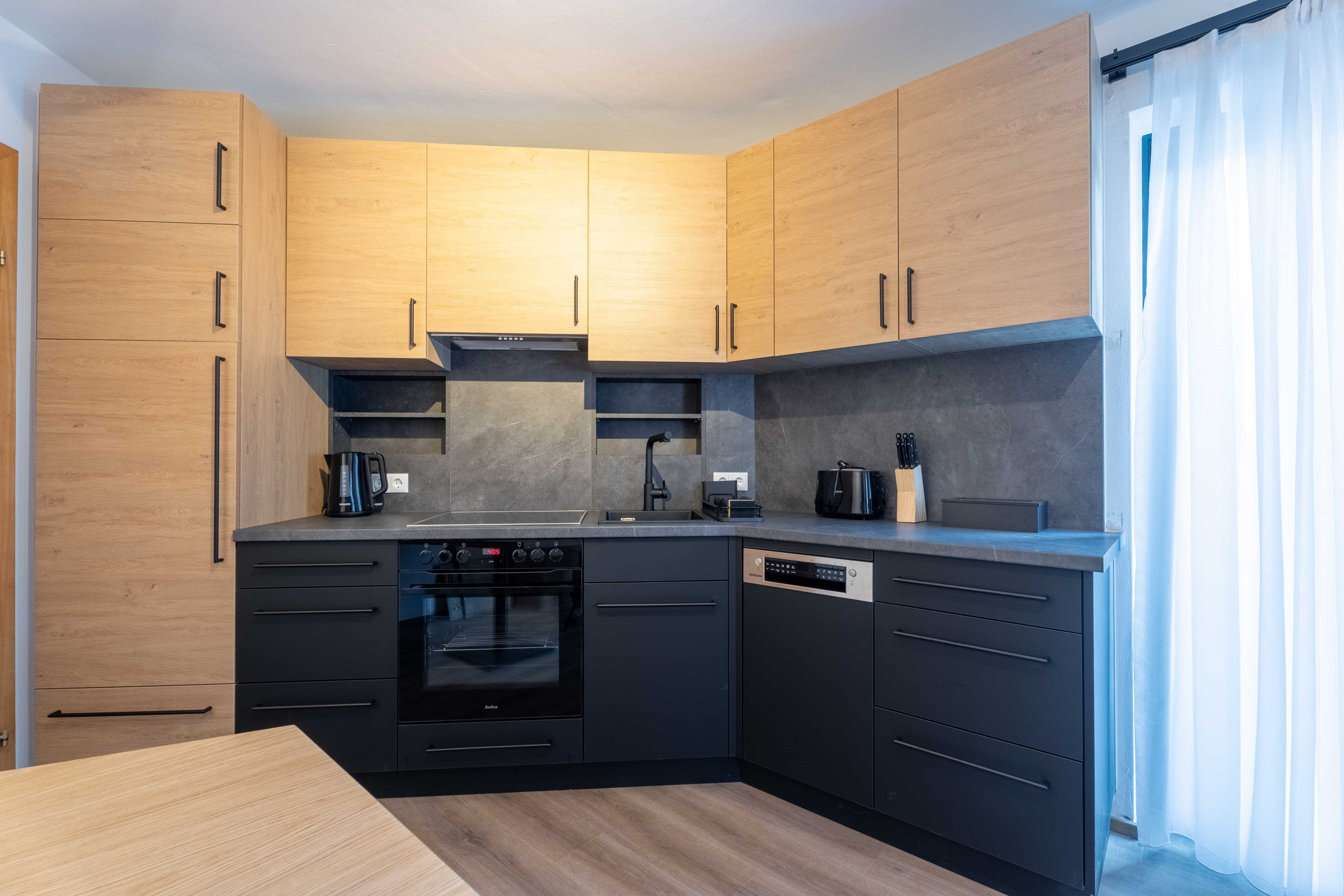 Das Apartment verfügt über zwei Schlafzimmer mit Doppelbetten sowie ein komfortables Schlafsofa im Wohnbereich – ideal für bis zu sechs Erwachsene. Die offene Wohnküche ist modern ausgestattet mit Backofen, Herd, Geschirrspüler, Kühlschrank, Mikrowelle und Kaffeemaschine. Der angrenzende Essbereich lädt zu gemeinsamen Mahlzeiten und gemütlichen Abenden ein, während große Fenster viel Licht und einen herrlichen Blick auf die umliegende Bergwelt bieten.