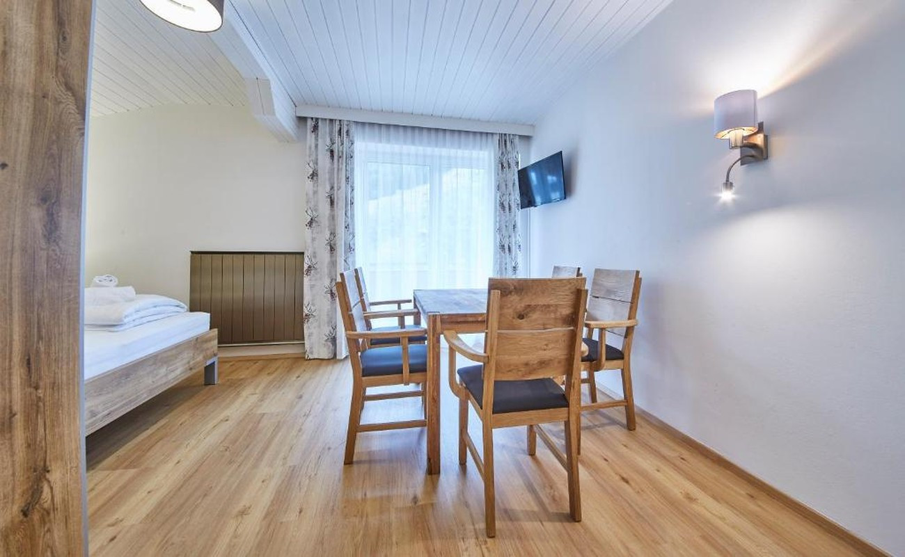 Eines der Schlafzimmer dient gleichzeitig als Essbereich. In einem kleinen, angrenzenden Raum befindet sich die kompakte Küche, ausgestattet mit Kochplatten, Kühlschrank und Kaffeemaschine sowie allem Notwendigen für die Selbstversorgung im Urlaub. In den Badezimmern stehen Haartrockner zur Verfügung. Die Einrichtung ist schlicht, funktional und gepflegt – perfekt für einen aktiven Aufenthalt in den Bergen.