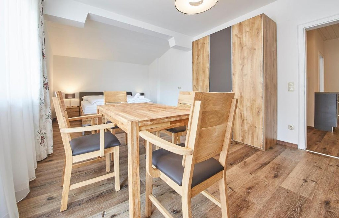 Eines der Schlafzimmer dient gleichzeitig als Essbereich. Die Küche ist mit Backofen, Kochplatten, Geschirrspüler, Kühlschrank und Kaffeemaschine ausgestattet und bietet alles, was Sie für die Selbstversorgung im Urlaub benötigen. Die Einrichtung ist schlicht, funktional und gepflegt – perfekt für einen aktiven Aufenthalt in den Bergen.