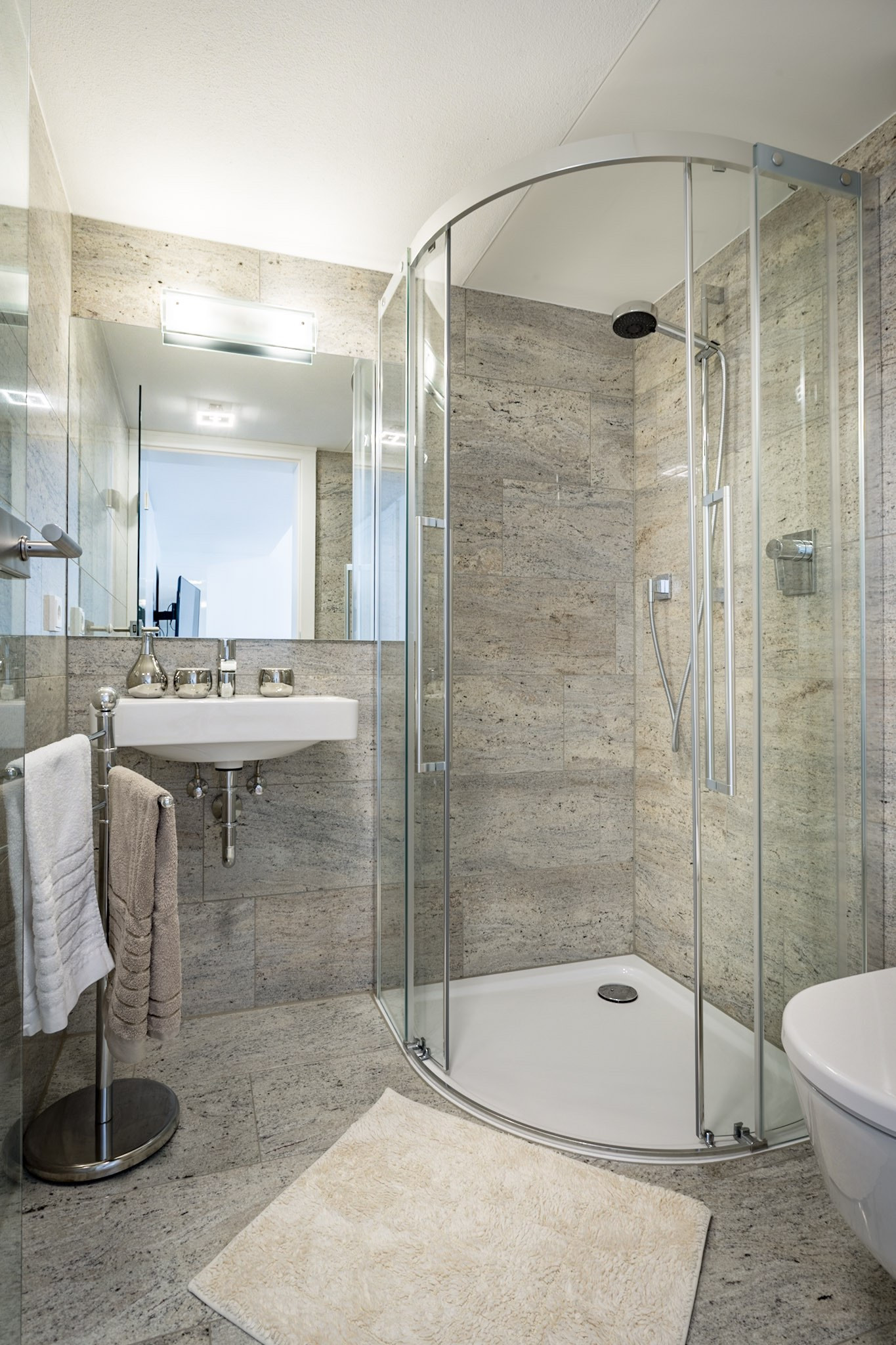 Das Apartment verfügt weiters über zwei Badezimmer en suite: eines mit Dusche & WC, das zweite mit Dusche, WC & Badewanne. Zusätzlich steht ein separates Gäste-WC im Eingangsbereich zur Verfügung.